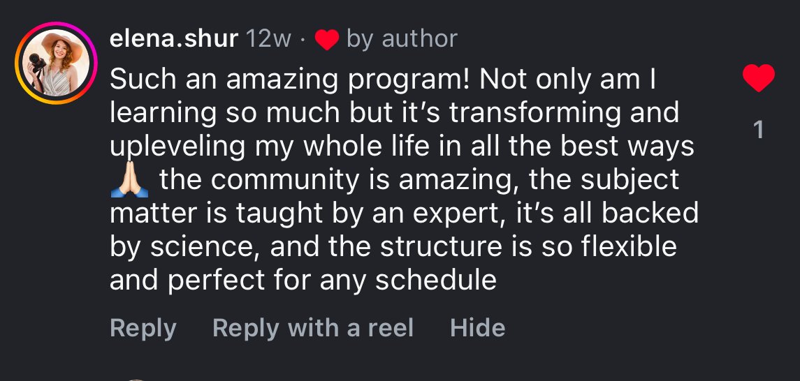 “I literally can’t even put into words how powerful this program has been. The tools, the community, the personal growth - ALL OF IT! It’s been such a beautiful, transformative experience that keeps expanding me in ways I didn’t expect. Obsessed is an understatement. I’ve never looked forward to learning until this damn program and everyone in it.”